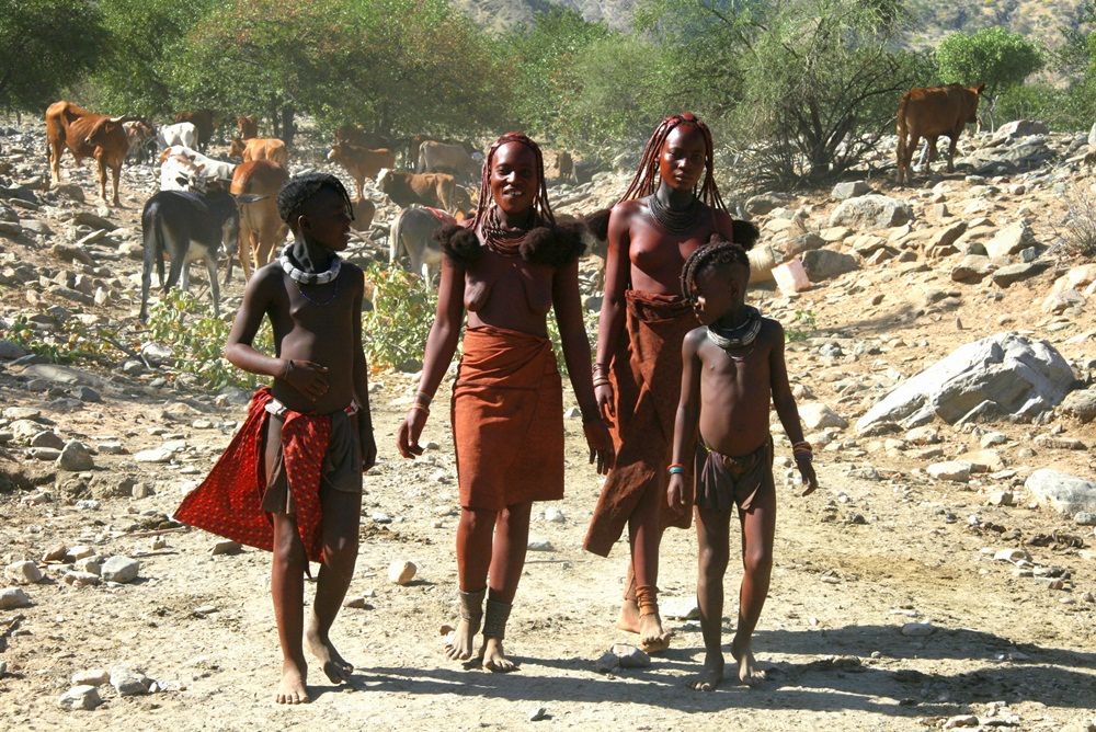 Die Frauen waren sehr kooperativ und nett und freuten sich über die große Aufmerksamkeit. Die männlichen Himbas passten gut auf. Man merkte, dass diese Familie noch nicht viel Kontakt mit Fremden hatte. |