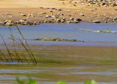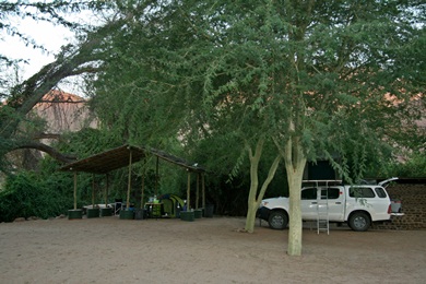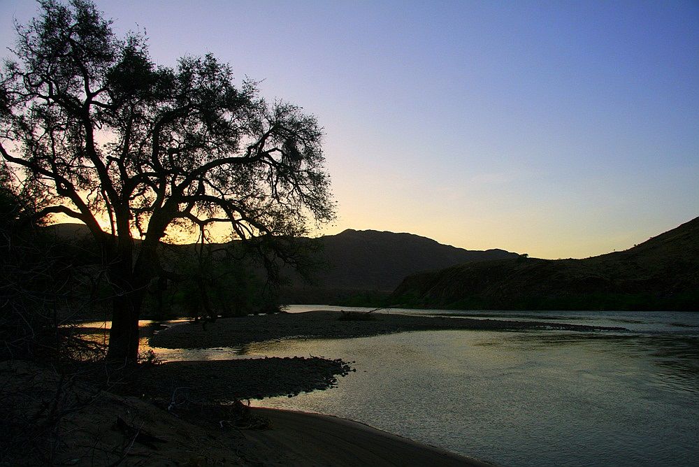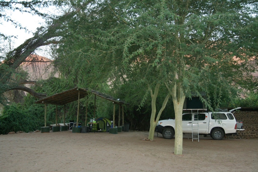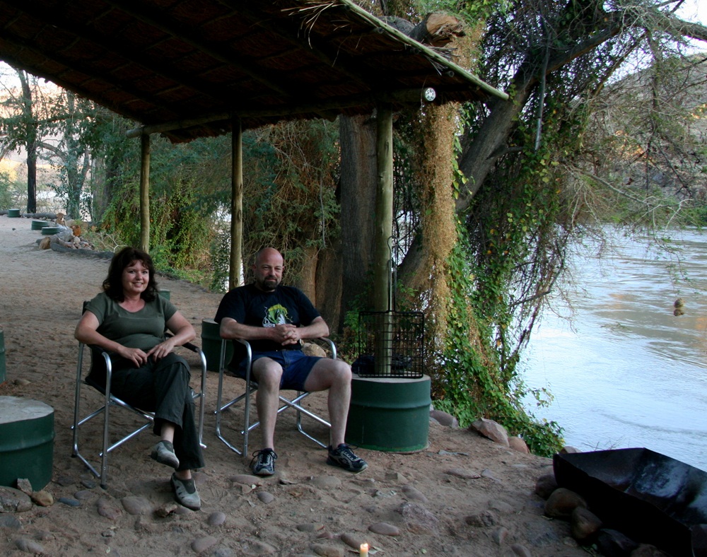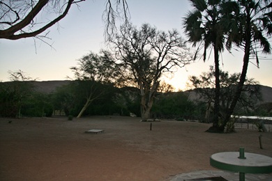 Ankunft im Camp Syncro am Ufer des Kunene . Von diesem Camp existiert nur noch der Campingplatz. Die schönen Bungalows sind vor ca. 1 Jahr dem Feuer zum Opfer gefallen. Der Besitzer möchte das Camp nicht mehr aufbauen. Der angelegte Garten war ebenfalls nicht mehr gepflegt. Schade! |