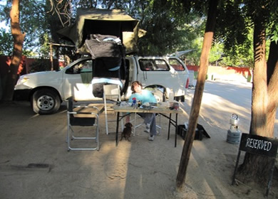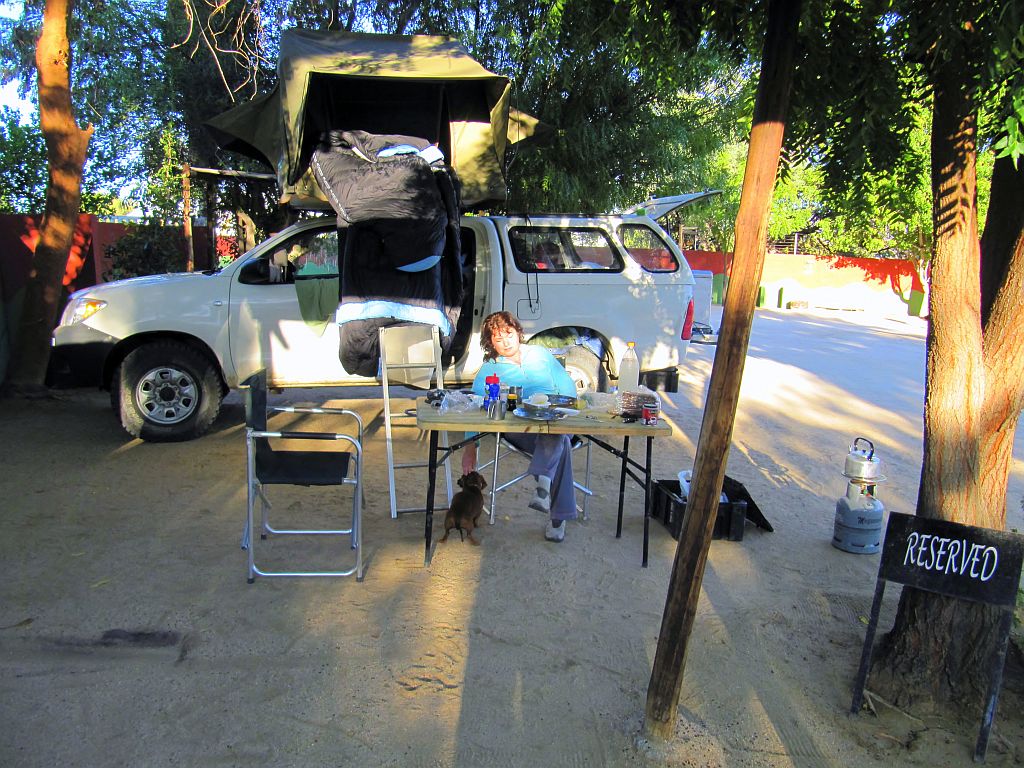 Am Abend grillten wir Braaiwoers (Bratwurst) und Kudu-Fleisch. Dazu gab es leckeren Salat und ein eisgekühltes Tafel Lager. Immer wieder bekamen wir Besuch von den heimischen Hunden der Campsite. Es waren "Dackel" - klein-flach-lang und kompakt. Es gab wohl 3 oder 4 davon und sie spekulierten stets auf etwas Essbares. Am Abend wurde das Eingangstor geschlossen und so fühlte man sich sehr sicher.