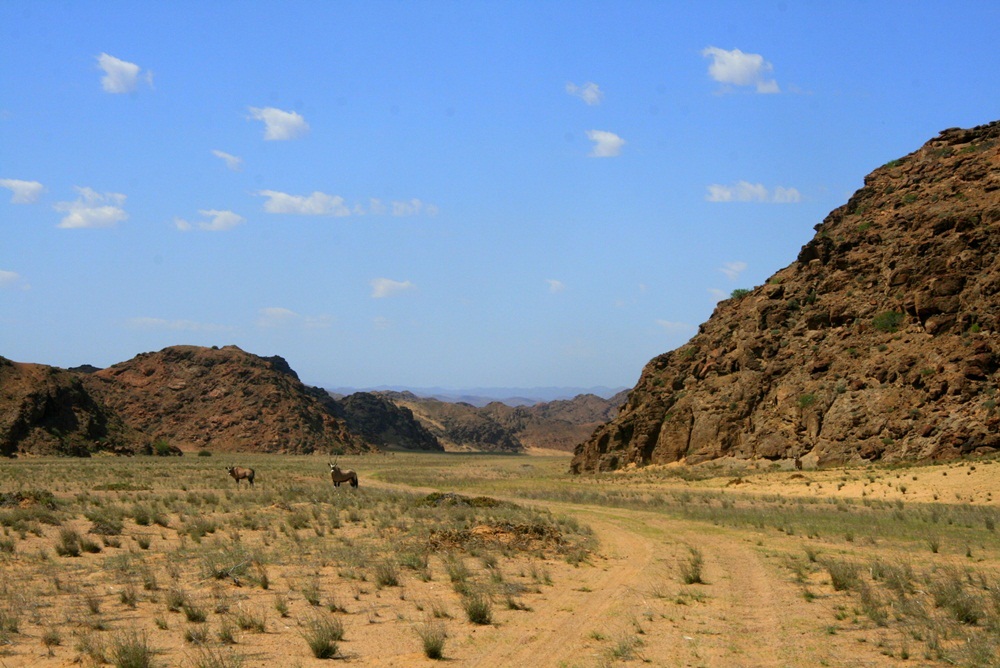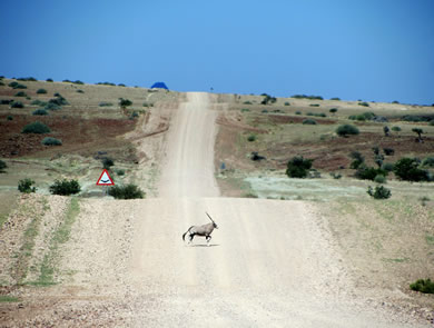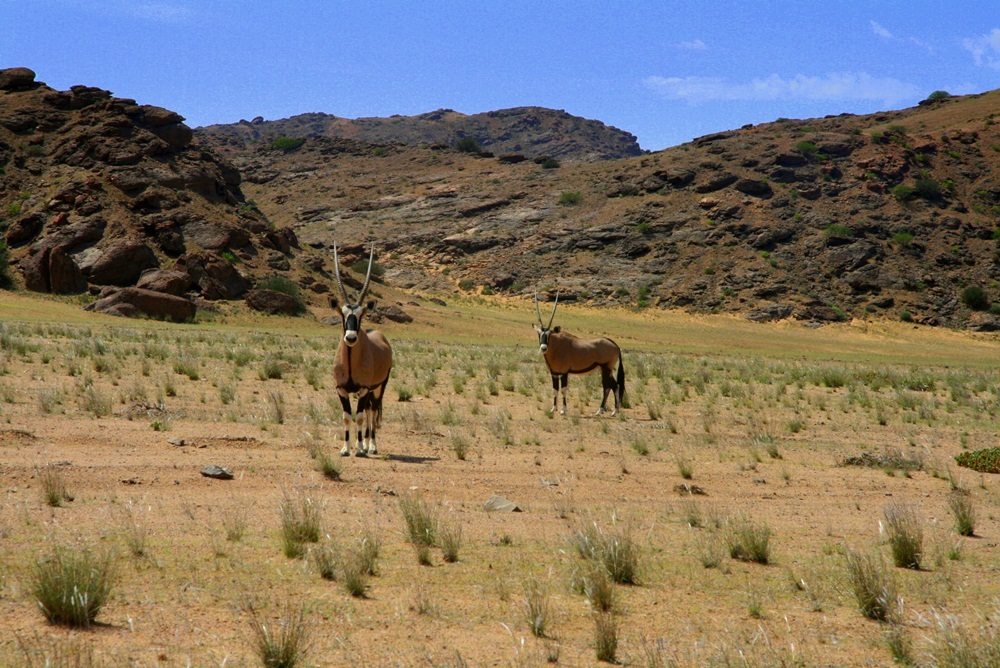 Einige der wenigen Oryxe auf unserem Weg. Sie gehören für uns mit zu den schönsten und edelsten Tiere Namibias. Sie sind aber nicht ungefährlich und vor den Hörnern muss man sich in acht nehmen. (das Fleisch schmeckt sehr gut). |