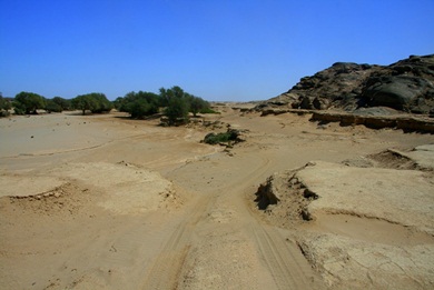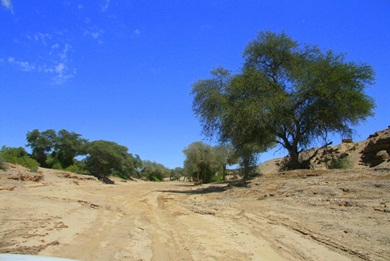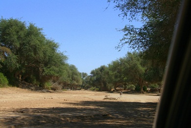 Dieses Flussbett ist wahnsinnig breit und mit vielen Bäumen bewachsen. Wir sahen viele Oryxe, Giraffen und andere Tiere. |