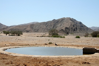 künstliche Wasserstelle in Dubis. Die großen Wasserbehälter werden regelmäßig von den Elefanten zerstört. Mittlerweile hat man eine Mauer drumherum gebaut. |