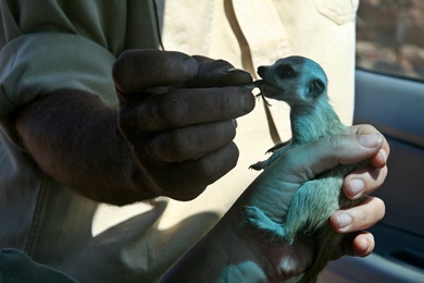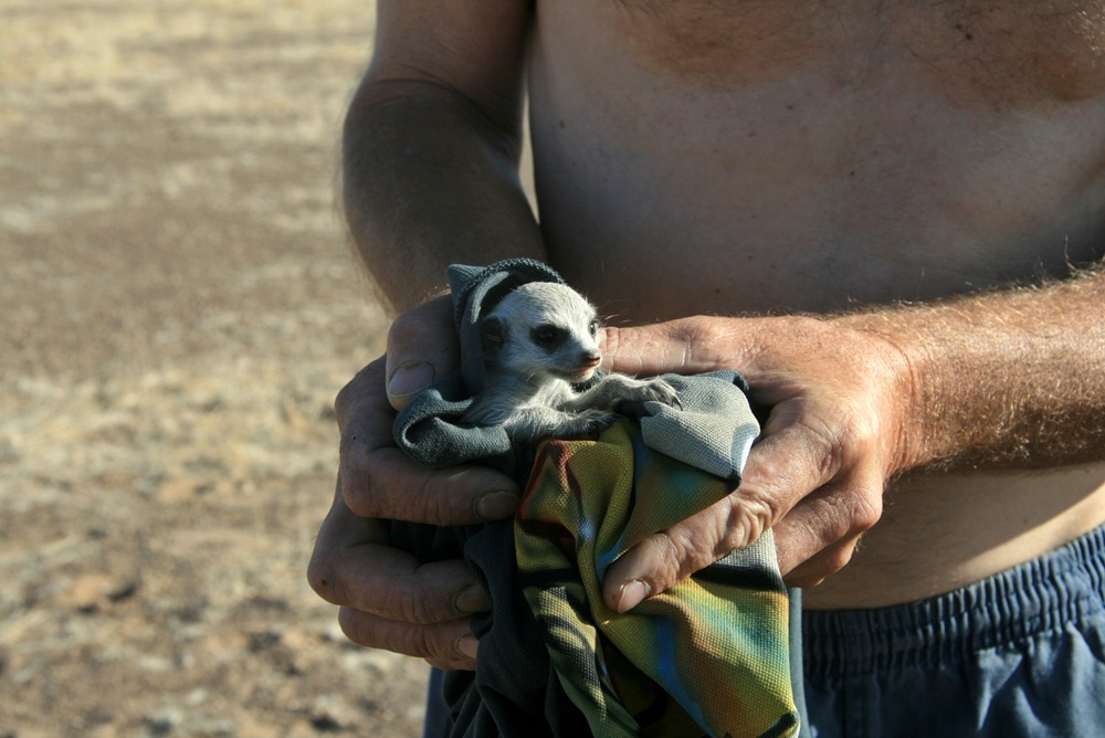 Irgendwann fanden wir in der unendlichen unwirtlichen Weite ein junges Erdmännchen. Marius beschloss es mit nach Camp Aussicht zu nehmen. Er hatte vor Jahren schon so einen kleinen Begleiter, der ihm auf Schritt und Tritt folgte. Die nächsten Tage hatte ich eine wichtige Aufgabe.