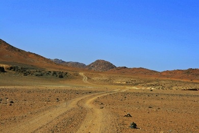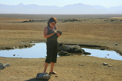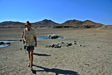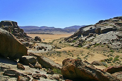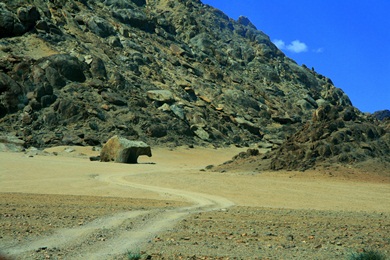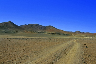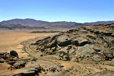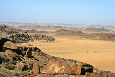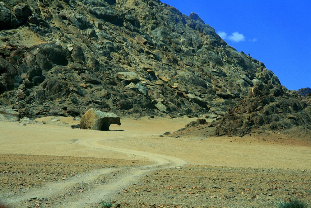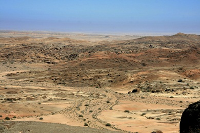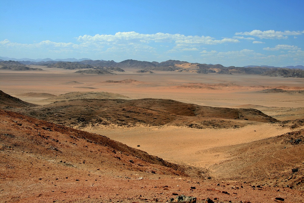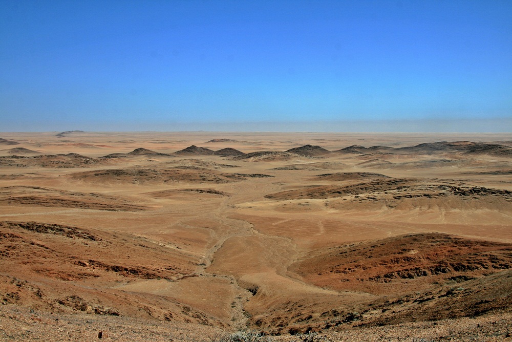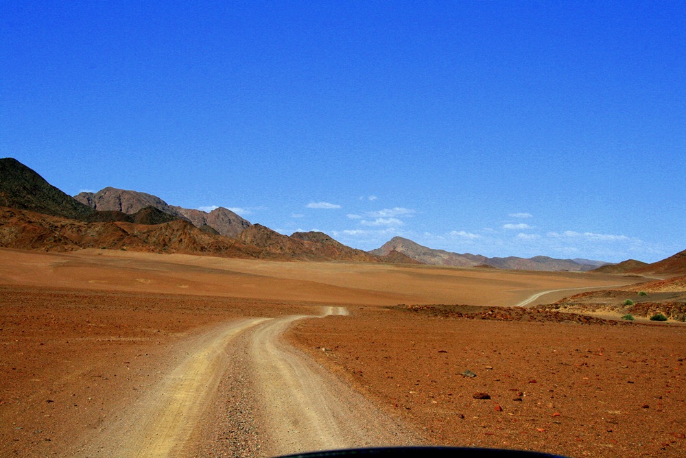 Wir fuhren weiter und kamen bald darauf zu einer kleinen Wasserstelle mitten im Nirgendwo. Leider waren um diese Tageszeit keine Tiere vorzufinden. Nach einer kurzen Rast ging es weiter Richtung Skeleton Coast. Die unendliche Weite mündete in felsige Landschaft. Wir erkannten die Region - hier waren wir schon vor 3 Jahren. Es war ein Gebirge zwischen zwei Wüstenlandschaften. |