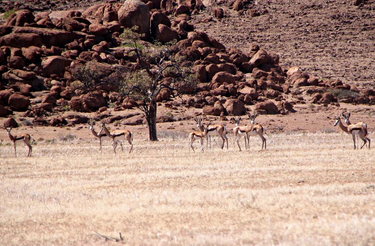 D2303 - immer wieder Springböcke am Straßenrand. Sie sind einige der wenigen Tiere, die hier überleben können. Manchmal waren sie auf den ersten Blick nicht gleich zu erkennen. Die Farbe des Felles unterscheidet sich fast nicht von der Umgebung. |