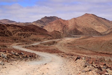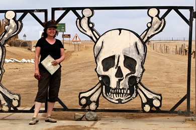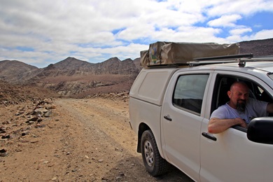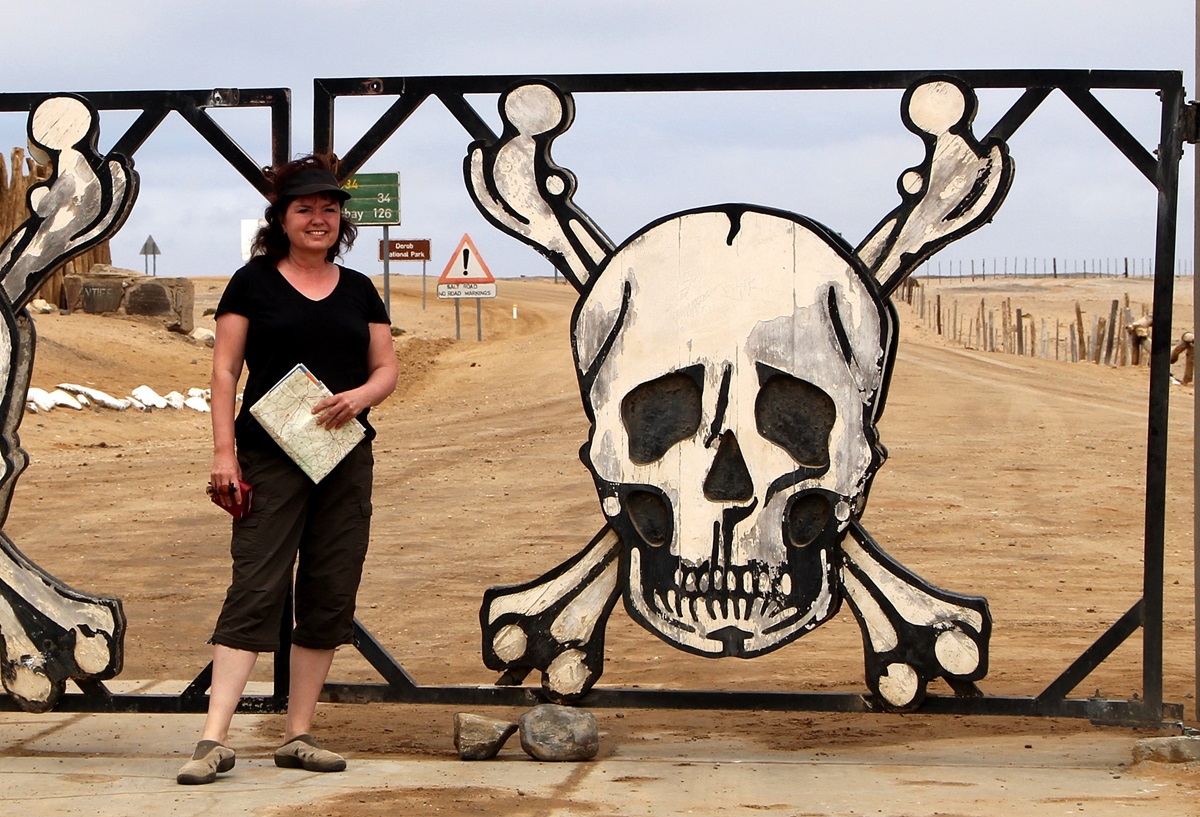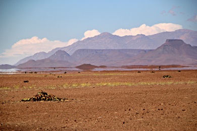 Jochen wollte unbedingt zum Skeleton Coast Gate mit den Totenköpfen. Das passte sehr gut, denn so lernten wir auch den nördlichen Dorob Nationalpark kennen - zumindest einen Teil (entlang der D2303) davon. Dieser Teil des Parks ist eine bergige Geröllwüste - grüne Pflanzen fanden wir darin nicht.