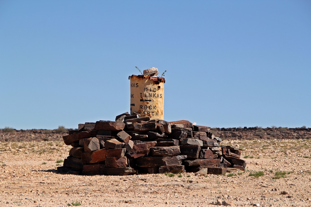 Wegweiser im Namib Naukluft Park eine alte Tonne, die beschriftet wurde - völlig ausreichend - jeder weiß bescheid |
