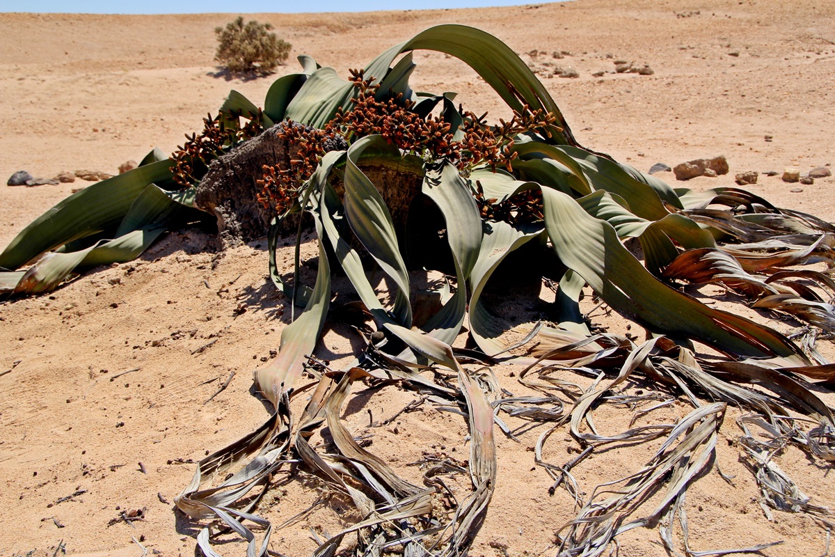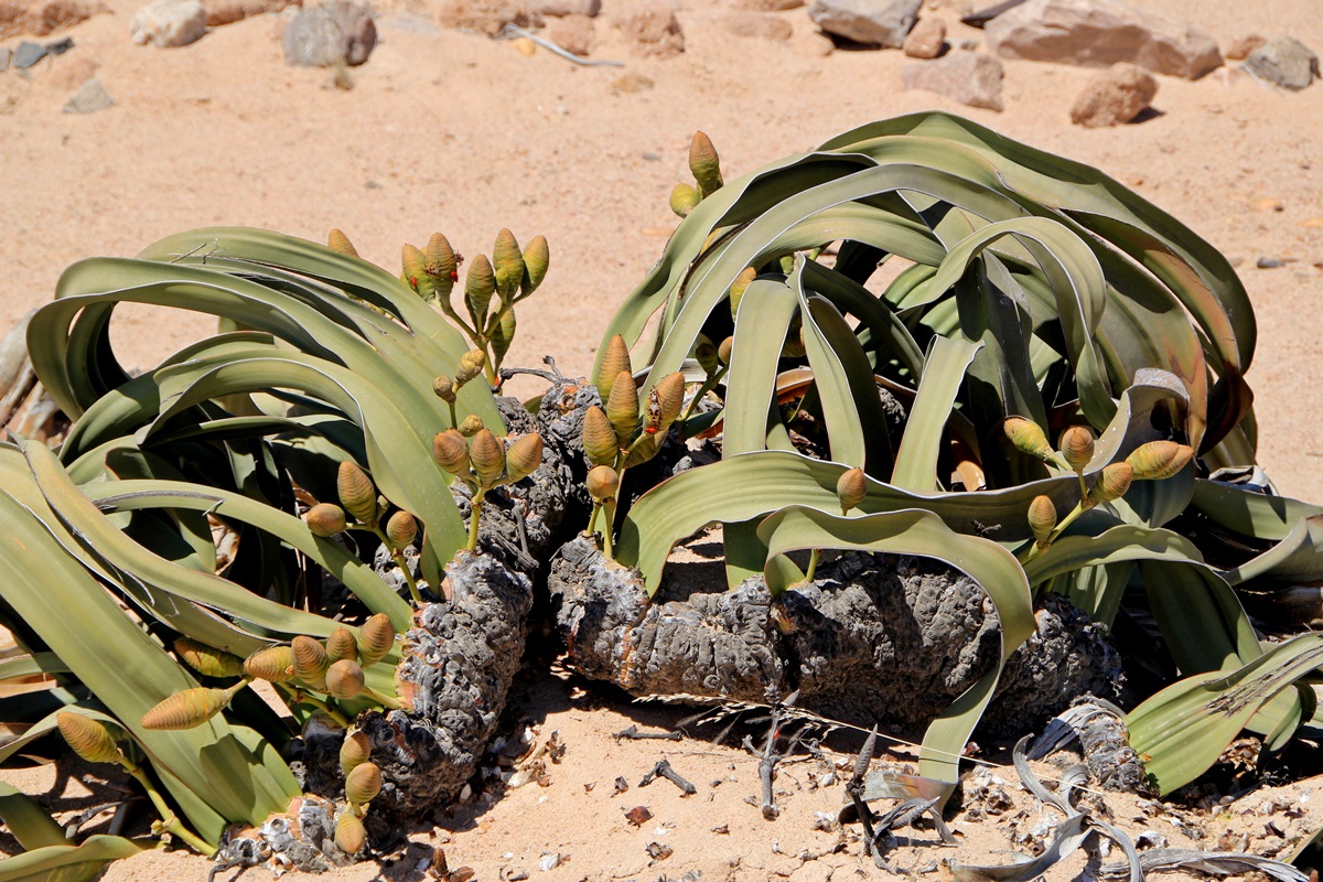 2 große Welwitschias - links die männliche Pflanze, rechts die weibliche Pflanze. Die Pflanzen bestehen aus einem rübenfömigen Körper und haben lediglich 2 Blätter, die sich zunehmend zerfasern und bis zu 2,5 Meter lang werden können. Die Bestäubung erfolgt durch Insekten. Als Kandidaten werden Wanzen und Wespen diskutiert. Auf jeden Fall sind die beiden Pflanzen schon steinalt. Welwitschias können bis zu 2.000 Jahre alt werden und leben in bestimmten Landstrichen. |