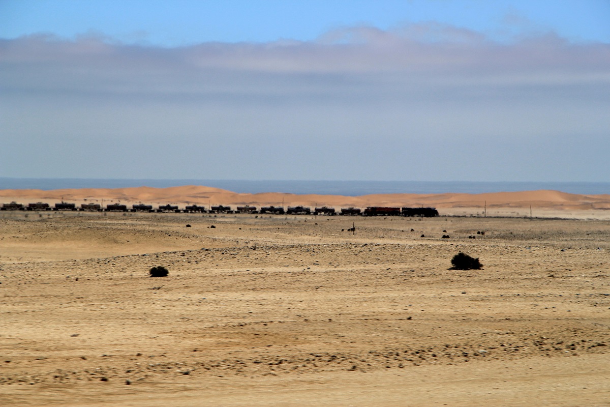 ein seltenes Bild - ein Güterzug in Namibia - ganz hinten sieht man schon das Meer |
