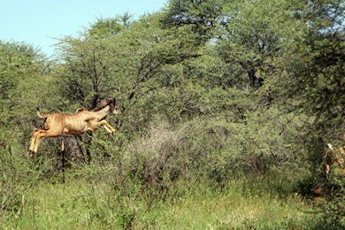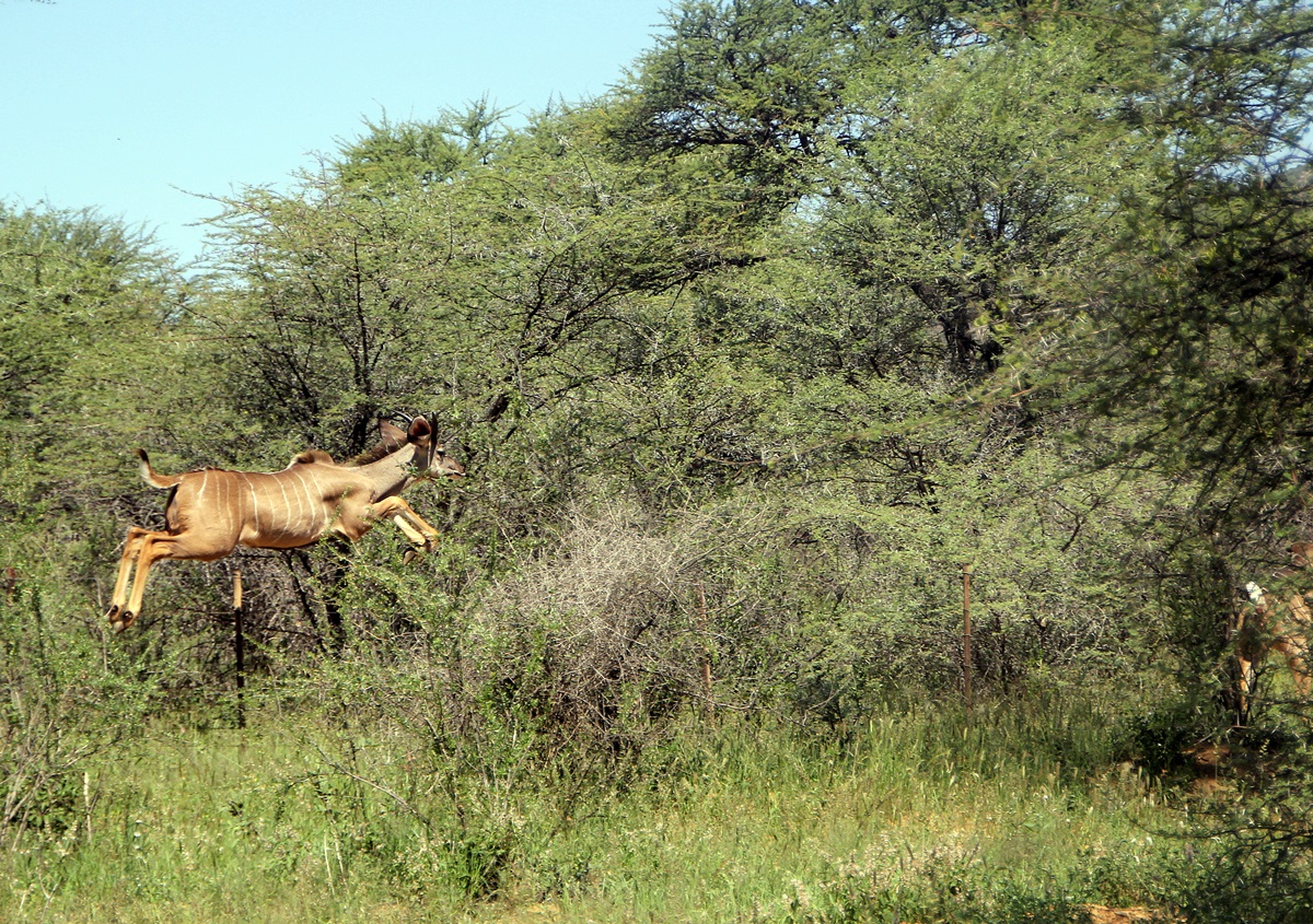 Kudu beim Sprung über einen Zaun |