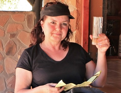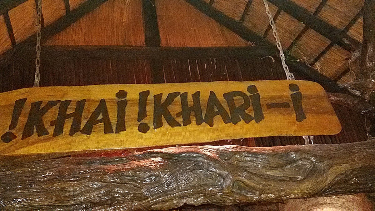an der Bar der Palmwag Lodge. Jochen übte die Aussprache der oben aufgeführen Worte. Es war nicht einfach, denn hier handelt es sich um die Sprache der einheimischen Damara, die viele Schnalzlaute verwenden. Es klappte mit jedem Tafel Lager besser. In der Sprache der Damara bedeutet es "Eiskaltes Bier". |