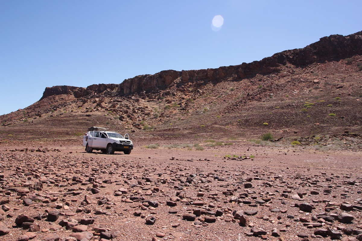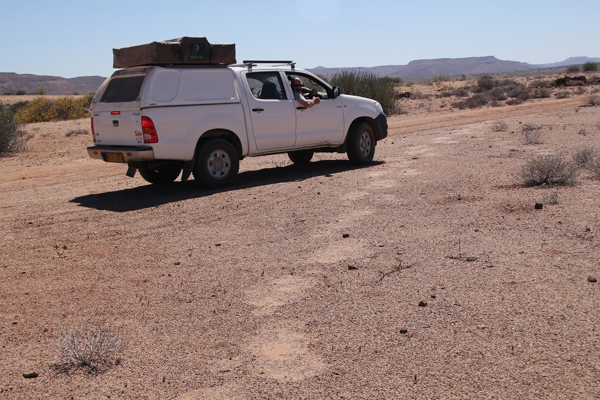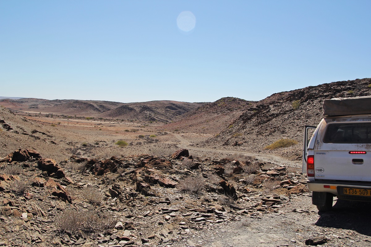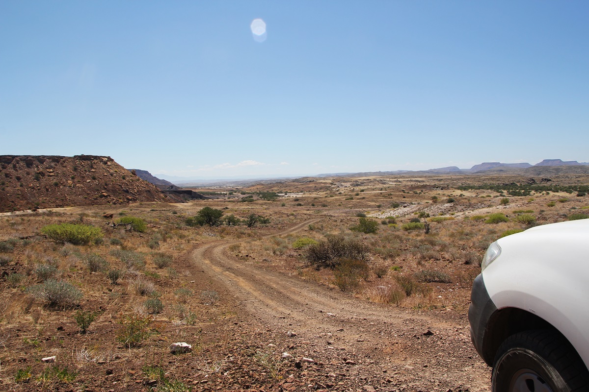 Wir verließen an diesem Morgen das Ugab Base Camp Richtung Desolation Valley. Die Route war eingezeichnet als 4WD-Trail. Die Strecke gestaltete sich unwirtlich, zum Teil anspruchvoll für Mensch und Fahrzeug, aber zugleich landschaftlich genial. Wir fuhren durch die Region Doronawas/Twyfelfontein-Uibasen Richtung Twyfelfontein. Wegweiser gab es auf der ganzen Strecke nur zwei. Für die ca. 75 Kilometer benötigten wir ca. 4,5 Stunden. Hin und wieder mal kamen uns Zweifel, ob wir noch auf der richtigen Route waren. Die Spuren der Route waren nicht immer zu erkennen. In dieser Gegend blieb vor ein paar Jahren ein Ehepaar mit ihrem Fahrzeug liegen. Die wurden nach Tagen gefunden. Der Mann hatte es nicht geschafft - die Frau konnte gerettet werden.