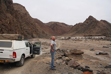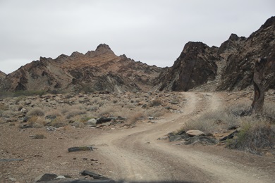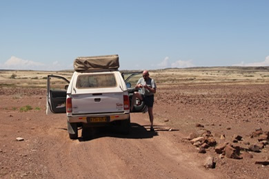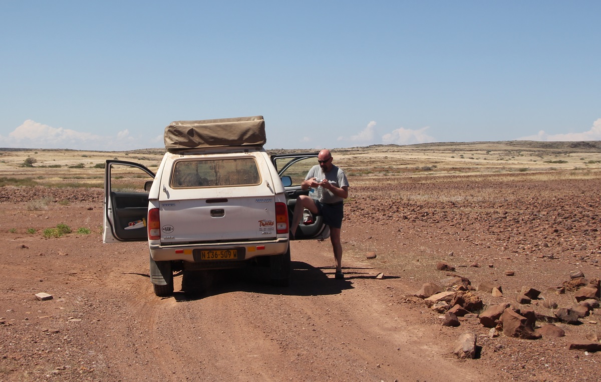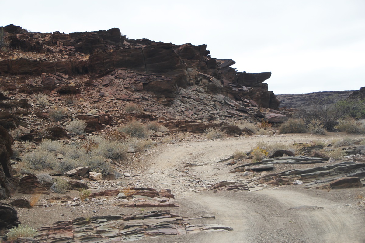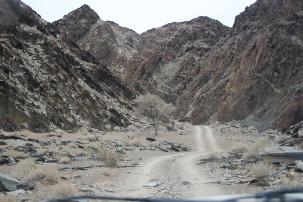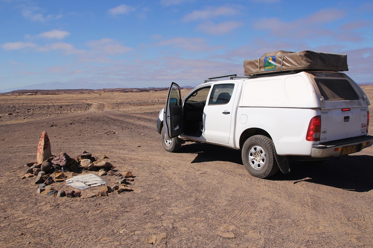 Wir verließen an diesem Morgen das Ugab Base Camp Richtung Desolation Valley. Die Route war eingezeichnet als 4WD-Trail. Die Strecke gestaltete sich unwirtlich, zum Teil anspruchvoll für Mensch und Fahrzeug, aber zugleich landschaftlich genial. Wir fuhren durch die Region Doronawas/Twyfelfontein-Uibasen Richtung Twyfelfontein. Wegweiser gab es auf der ganzen Strecke nur zwei. Für die ca. 75 Kilometer benötigten wir ca. 4,5 Stunden. Hin und wieder mal kamen uns Zweifel, ob wir noch auf der richtigen Route waren. Die Spuren der Route waren nicht immer zu erkennen. In dieser Gegend blieb vor ein paar Jahren ein Ehepaar mit ihrem Fahrzeug liegen. Die wurden nach Tagen gefunden. Der Mann hatte es nicht geschafft - die Frau konnte gerettet werden.