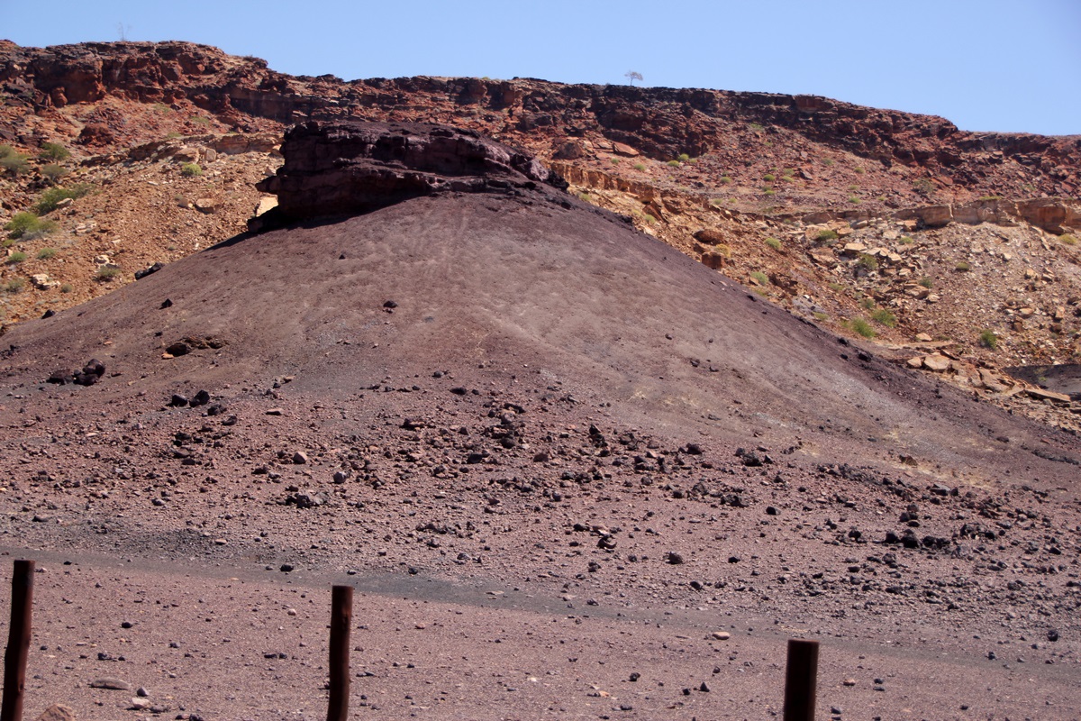 | Burnt Mountain - Verbrannter Berg. Der Verbrannte Berg (Burnt Mountain) ist ein Berg entstanden durch einem erkalteten Lavastrom. Er überragt seine Umgebung um etwa 200 Meter und ist unweit der Orgelpfeifen an der Pad 3254 Der verbrannte Berg gilt seit 1956 als Nationaldenkmal von Namibia |