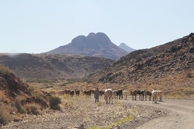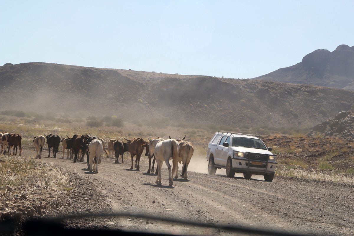 | Kühe der Damaras auf Pad - sie machen nur ungern Platz |