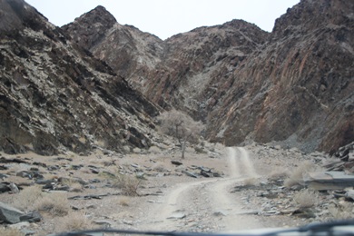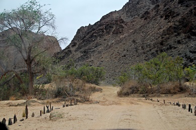 | Ausfahrt Ugab Base Camp Richtung Desolation Valley. Rechts und links dienten die Steine als Straßenbegrenzer. |