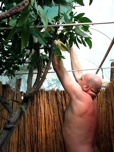 mit dem warmen Wasser die Dusche (Eimer mit Sprühkopf) damit auffüllen.