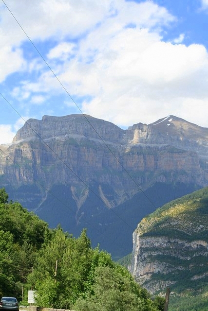 oder ins Ordesatal. Wir entschieden uns für das Ordesatal, denn laut Landkarte waren es einfache Strecke nur ca. 20 Kilometer für die Öffentlichkeit. Dennoch wollen wir diesen kurzen Abstecher nicht missen. Mit jedem Kilometer rückten die mächtigen Berge immer enger zusammen. Die Felsen zeigten verschiedene Farben bzw. Gesteinsformationen. Für Wanderer bestimmt das Paradies. Kurz nach dem Ort Torla kreisten Geier über uns. Es war sehr beeindruckend - vorallem die Größe der Tiere. |