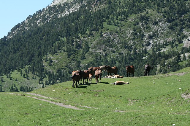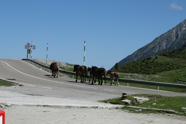 Ich konnte mich gerade noch hinter einem Straßenschild in Deckung bringen, wobei das Schild nicht gerade DER Schutz gewesen wäre. Argwönisch blieben 2 - 3 Tiere stehen und beobachteten mich, trollten sich aber dannn doch davon. Pferde sind zwar schön, aber für mich zu groß! Mit Puls 300 rannte ich zu Jochen zurück. Ich konnte die nächsen Minuten bzw. gefühlten Stunden kaum meine Cappuccinotasse vor lauter zittern halten. Das war mein bislang größtes Abenteuer in den Pyrenäen! |