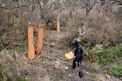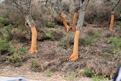 Hier und da lag noch ein Stück geschälter Rinde rum - Jochen überlegte ob er ein Stück als Erinnerung mitnehmen soll...... bis er die Bewohner der Korkeichen enteckte...... |