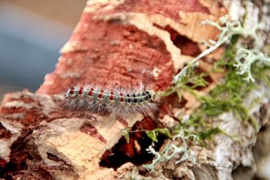 es wuselte überall von diesen Tieren - ca. 4 cm lang. Ursprünglich war das mal ein Schwammspinner (Schmetterlingsart), der seine Eier in die Rinde gelegt hatte und im Frühjahr daraus diese Raupe schlüpfte, die die Blätter kahl frisst.