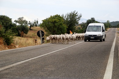 Hier bringen die Hunde die Schafe nach Hause - der Bauer fährt im Auto nebenher |