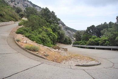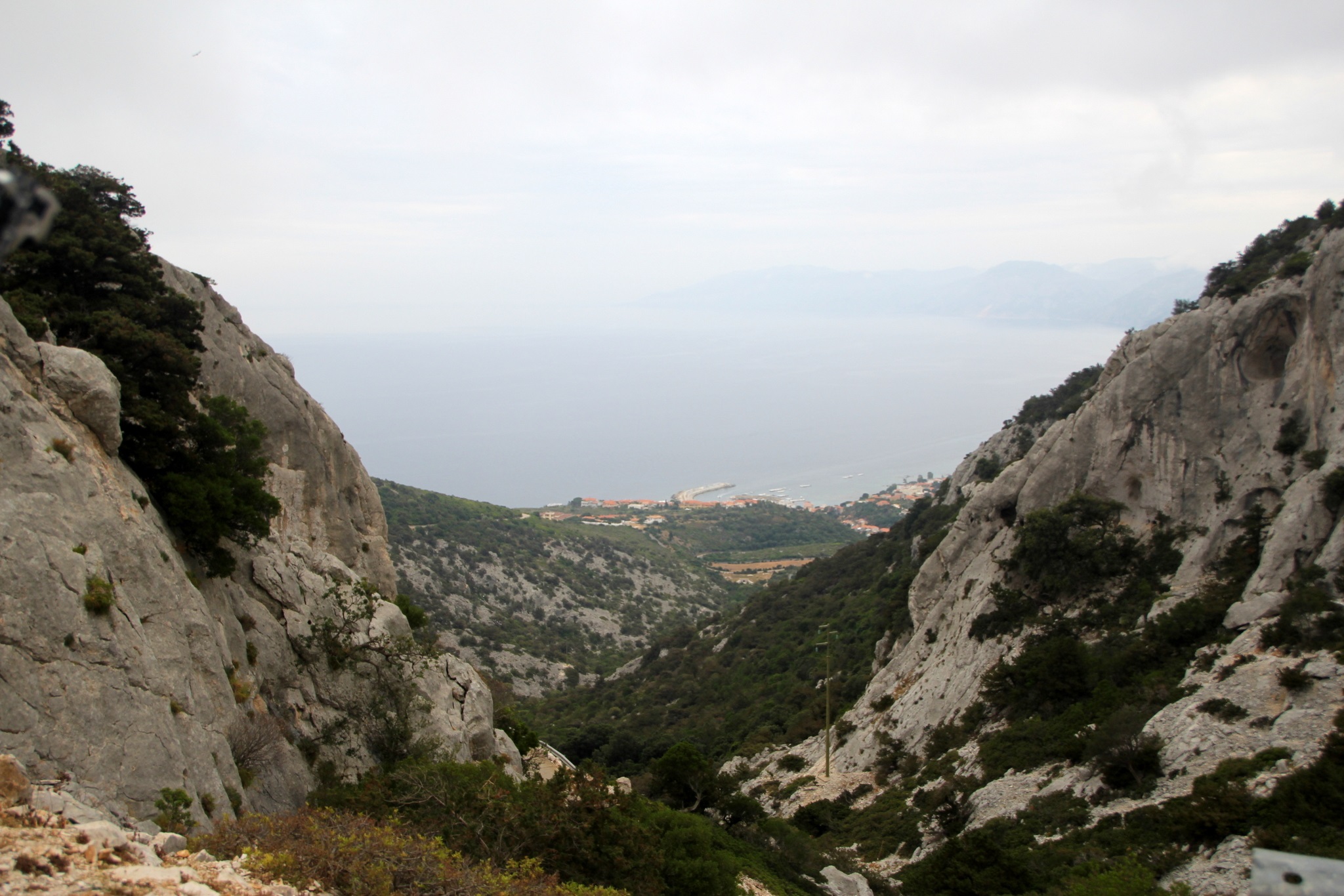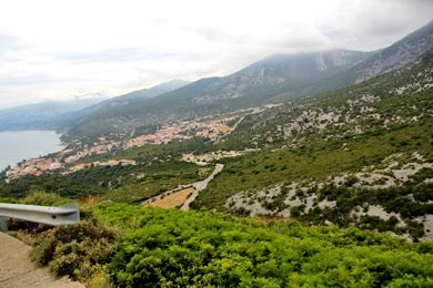 Alte Straße von Dorgali nach Cala Gonone. Die Straße führt etwas oberhalb von Dorgali durch Gärten und einsame Gehöfte, vorbei an dem Archäologischen Museum und schließlich geht es eine - wie es scheint alte kurvenreiche Militärstraße über einen Pass hinunter nach Cala Gonone. Am Scheitelpunkt hatte man fantastische Ausblicke auf die Küste und das wunderbar blaue Meer. |