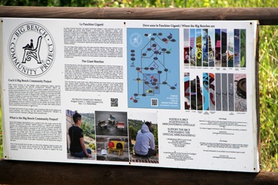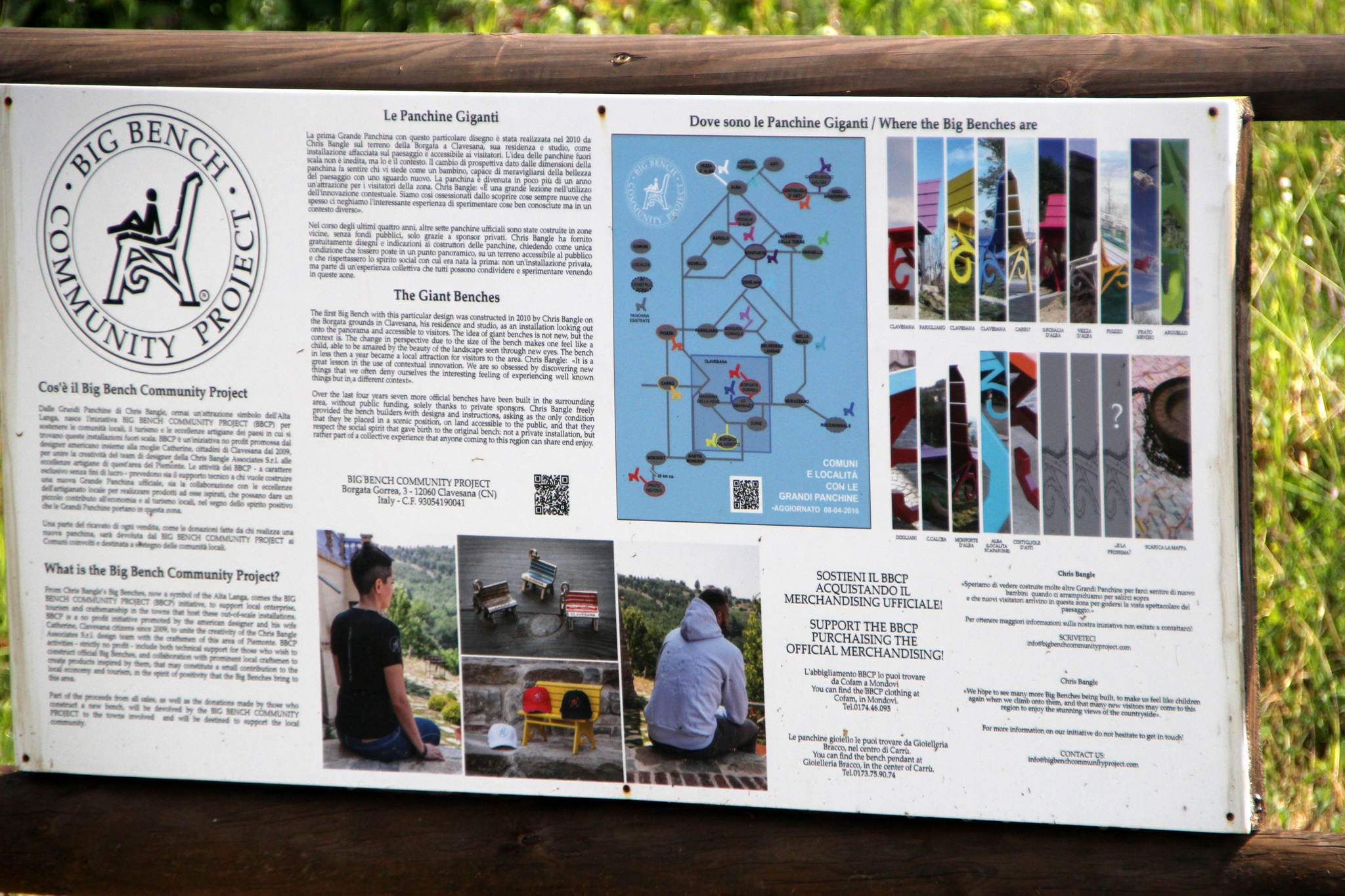 In der Region Ligurien/Piemont gibt es ein Communales Projekt - big Bench - große Sitzbänke - an schönen Aussichtsstellen. Erwachsene können hier nachempfinden, wie schwer es kleinere Kinder in der Welt der Erwachsenen haben...... Das Projekt wurde in 2010 von Chris Bangle gegründet. Mit Hilfe von privaten Sponsoren wurden in den nächsten Jahren über 10 weitere - big benches - in der Region gebaut. Mittlerweile wird dieses Projekt gerne von Besuchern in der Region angefahren. |