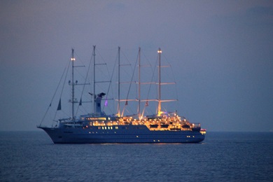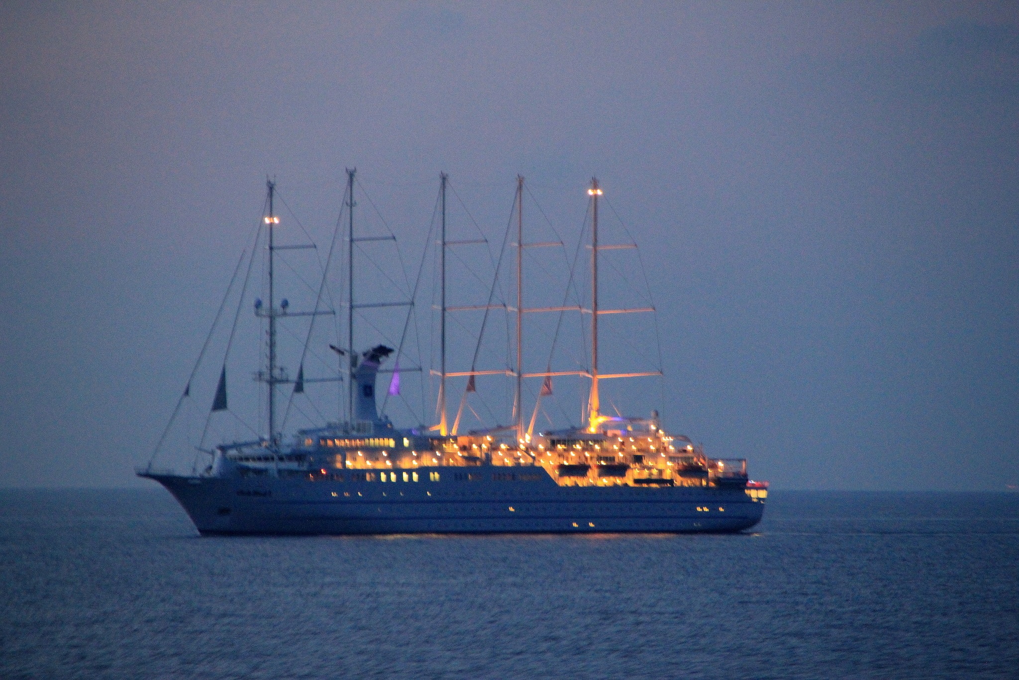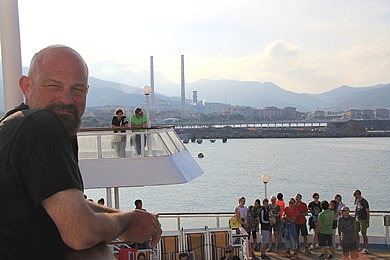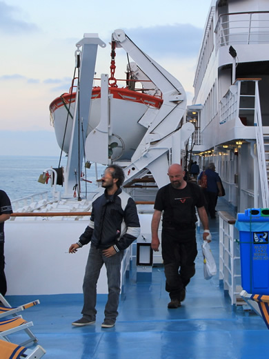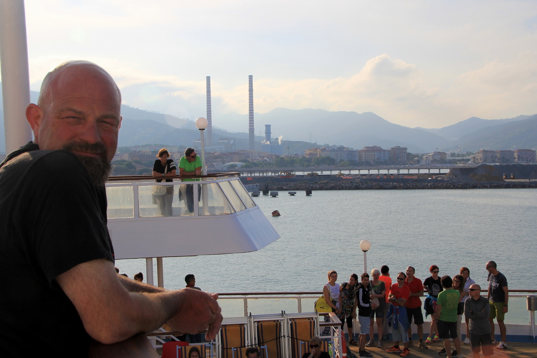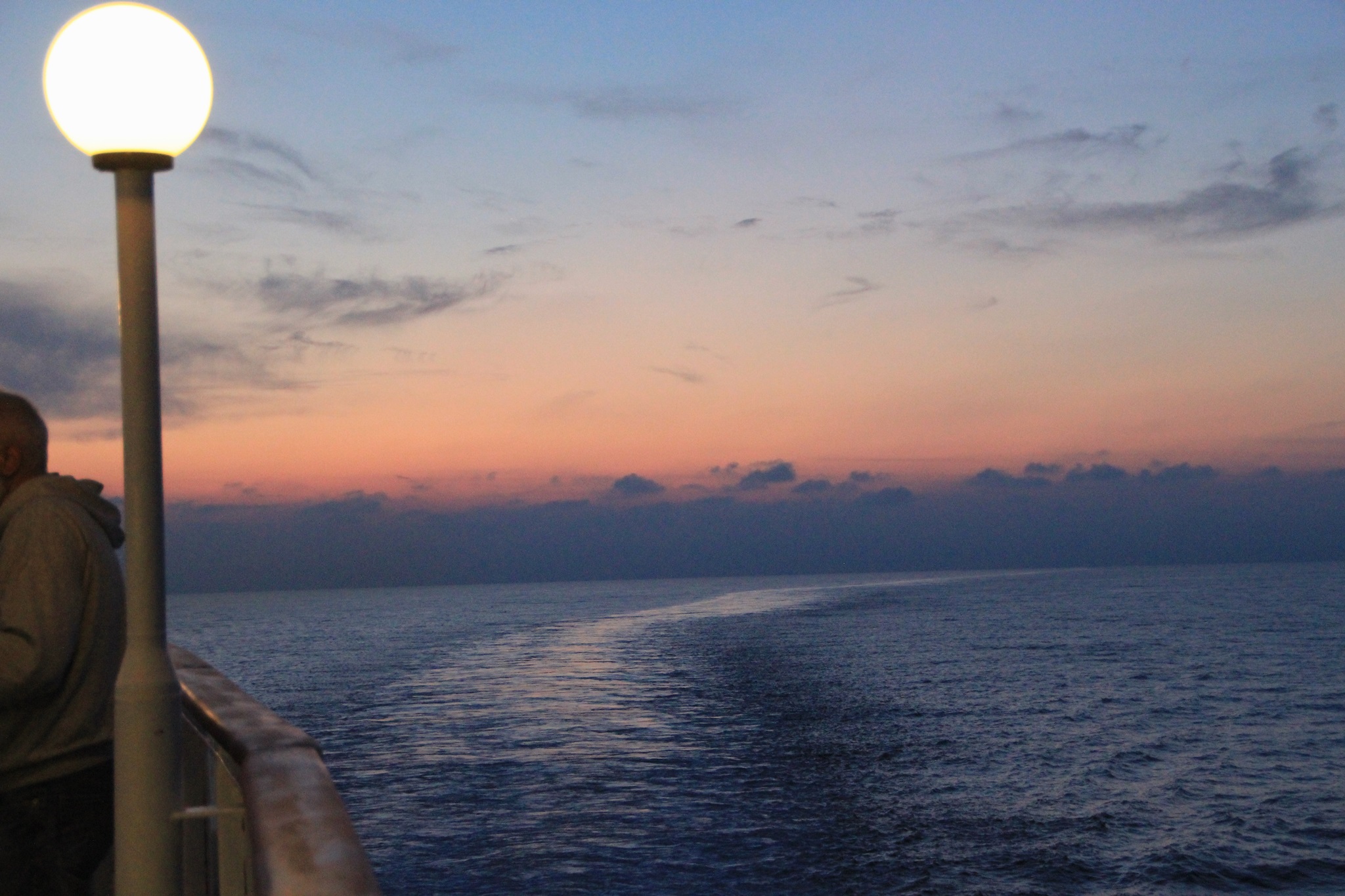 Nachdem alle Fahrzeuge und Passagiere an Bord waren, legte die Fähre ab. Schön ist auch immer wieder zu beobachten, wie das Festland in der Ferne verschwindet. Da die Temperaturen immer noch angenehm waren, holte Jochen unser Vesper aus der Kabine. Wir saßen noch lange und genossen den schönen Abend. Hin und wieder sah man in der Ferne ein anderes Schiff vorbeifahren. |
