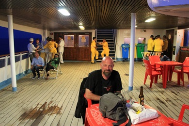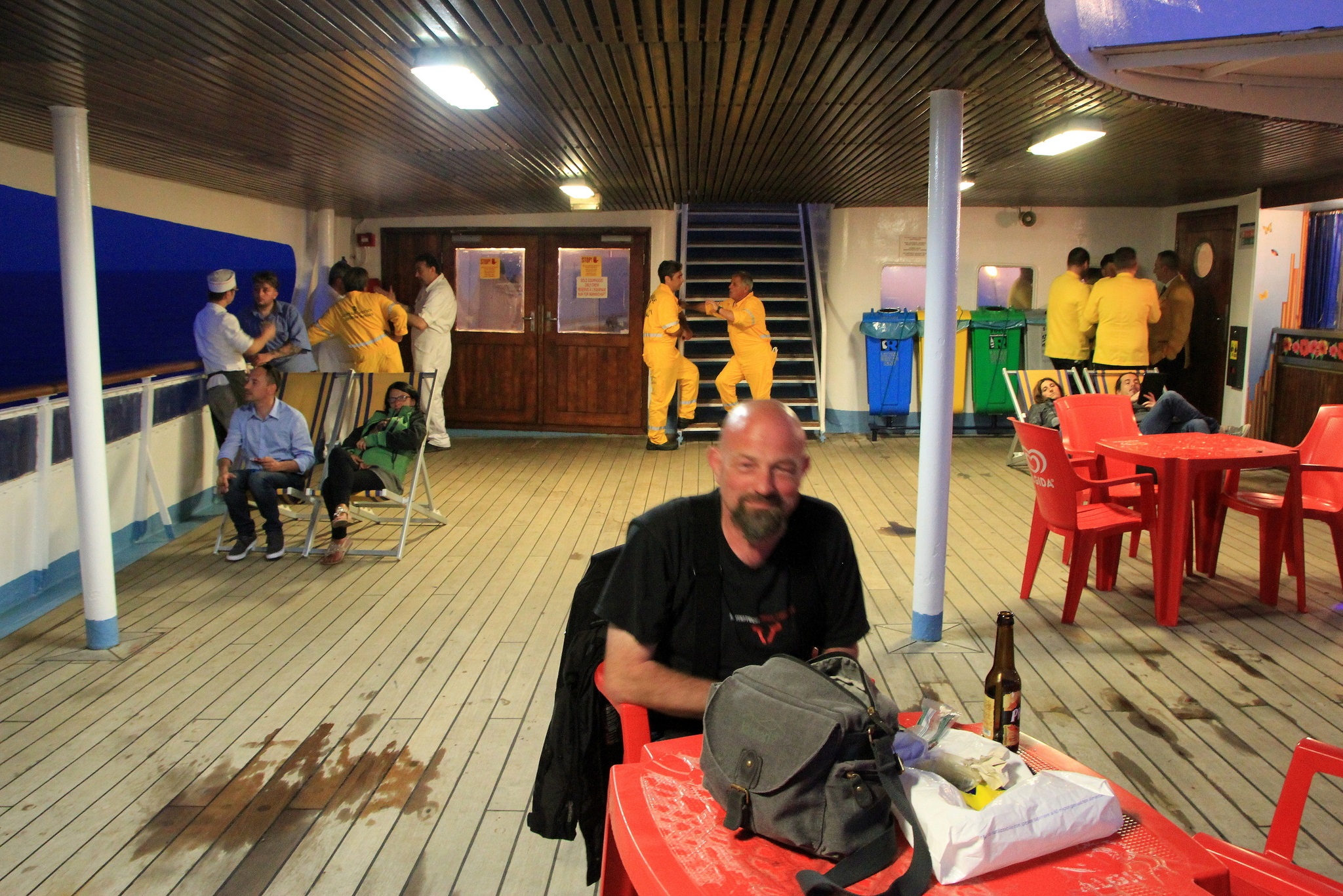 Das Einchecken verlief unkompliziert und schnell. Diesesmal mussten wir gar nicht am Kai warten, sondern wurden gleich von den Einweisern in den Bauch der Fähre gewunken. Das war fast schon stress. Das Gespann mussten wir wie üblich wieder platzsparend in einer Ecke parken. Das Handgepäck hatten wir morgens schon gerichtet und so konnten wir auch zügig unsere Kabine beziehen.
